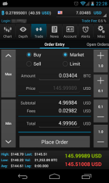 Buy and sell bitcoins over-the-counter or create limit orders. The new order entry screen provides shortcut trade buttons and an estimate of the fees for the order.